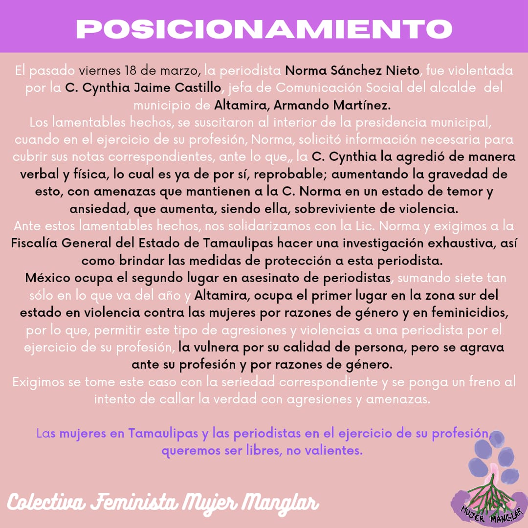 Altamira, Tamps.- La agrupación “Colectiva Feminista Mujer Manglar” emitió el exhortó de exigencia a la Fiscalía General del Estado de Tamaulipas (SIC) para que se haga un investigación exhaustiva y se le brinde las medidas de protección a la periodista Norma Sánchez, Directora del medio informativo “aquí Tamaulipas” quien fuera agredida el pasado viernes por la funcionaria de Comunicación Social de Altamira de la Administración que conduce Armando Martínez Manríquez, Cynthia Jaime Castillo.