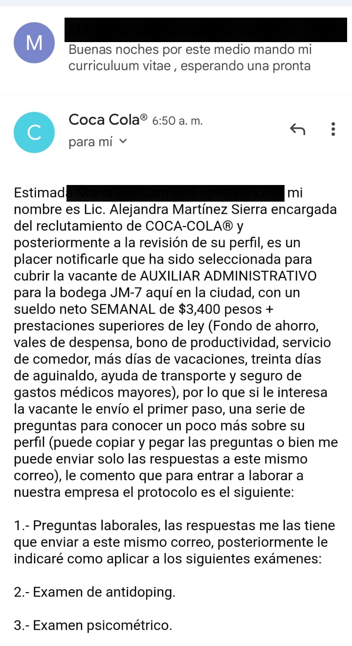 Se ponen en comunicación con el solicitante de empleo con la siguiente leyenda: “Estimad@ (nombre del aspirante al puesto) mi nombre es Lic. ( nombre del auxiliar) encargada del reclutamiento de COCA-COLA® y posteriormente a la revisión de su perfil, es un placer notificarle que ha sido seleccionado para cubrir la vacante de (puesto) para la bodega JM-7 aquí en la ciudad, con un sueldo neto SEMANAL de $3,400 pesos + prestaciones superiores de ley (Fondo de ahorro, vales de despensa, bono de productividad, servicio de comedor, más días de vacaciones, treinta días de aguinaldo, ayuda de transporte y seguro de gastos médicos mayores), por lo que si le interesa la vacante le envío el primer paso, una serie de preguntas para conocer un poco más sobre su perfil (puede copiar y pegar las preguntas o bien me puede enviar solo las respuestas a este mismo correo), le comento que para entrar a laborar a nuestra empresa el protocolo es el siguiente: