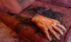 ORFILA sobre la Combustión Humana Espontánea, dice que al principio se observa una llama poco viva, azulada, difícil de extinguir por el agua y a la que, en contra, suele comunicar más actividad. Poco después, desaparece, sobreviniendo escaras profundas, convulsiones, delirio, vómitos, diarrea, un estado particular de putrefacción y muerte. La combustión sigue su curso con una rapidez asombrosa, pero sea cual fuere su intensidad, jamás se incinera enteramente el cuerpo. Algunas partes están medio quemadas o abrasadas mientras que otras están reducidas a cenizas. En lugar de éstas no se encuentran más que una cierta cantidad de materia grasienta y fétida y un carbón ligero, untuoso y odorífero. Es muy común ver los dedos de los pies y de las manos, algunas vértebras y porciones de cráneo que se libran de la destrucción completa mientras que se consume el tronco casi del todo. No se queman los muebles de madera y los demás cuerpos combustibles colocados a cierta distancia del individuo o si esto tiene lugar, no se queman por entero. Por el contrario, los vestidos que tiene el individuo se destruyen completamente. Las paredes y los muebles aparecen cubiertos de un hollín espeso, grasiento, muy negro, fétido, y en la habitación se siente un olor nauseabundo.