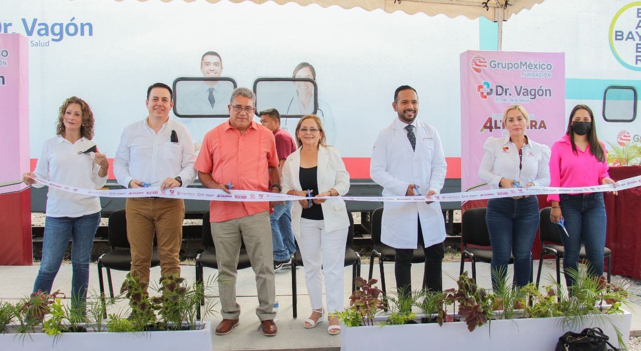 Altamira, Tamps.- Para formalizar la llegada del “Dr. Vagón, el tren de la salud” de Fundación Grupo México a Altamira, la presidenta del Sistema DIF local, C.P. Rossy Luque de Martínez, en compañía del alcalde Mtro. Armando Martínez Manríquez y personal de Grupo México efectuaron el corte de listón de estos servicios médicos itinerantes.