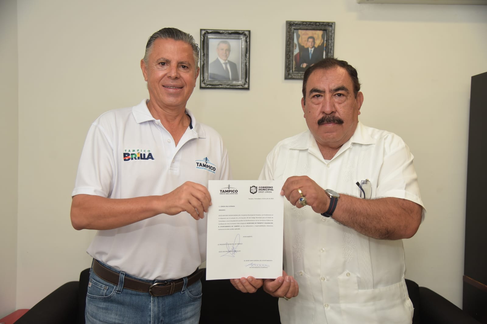 Tampico, Tamps.- El Presidente municipal de Tampico Chucho Nader entregó este lunes el nombramiento al nuevo Secretario de Tránsito Zenón Cruz Estrada, Contraalmirante de Infantería de Marina Retirado, a quien exhortó a conducirse por el camino de la responsabilidad, honestidad, transparencia y actitud de servicio, para seguir consolidando a Tampico como una ciudad ejemplar a nivel estatal y nacional.