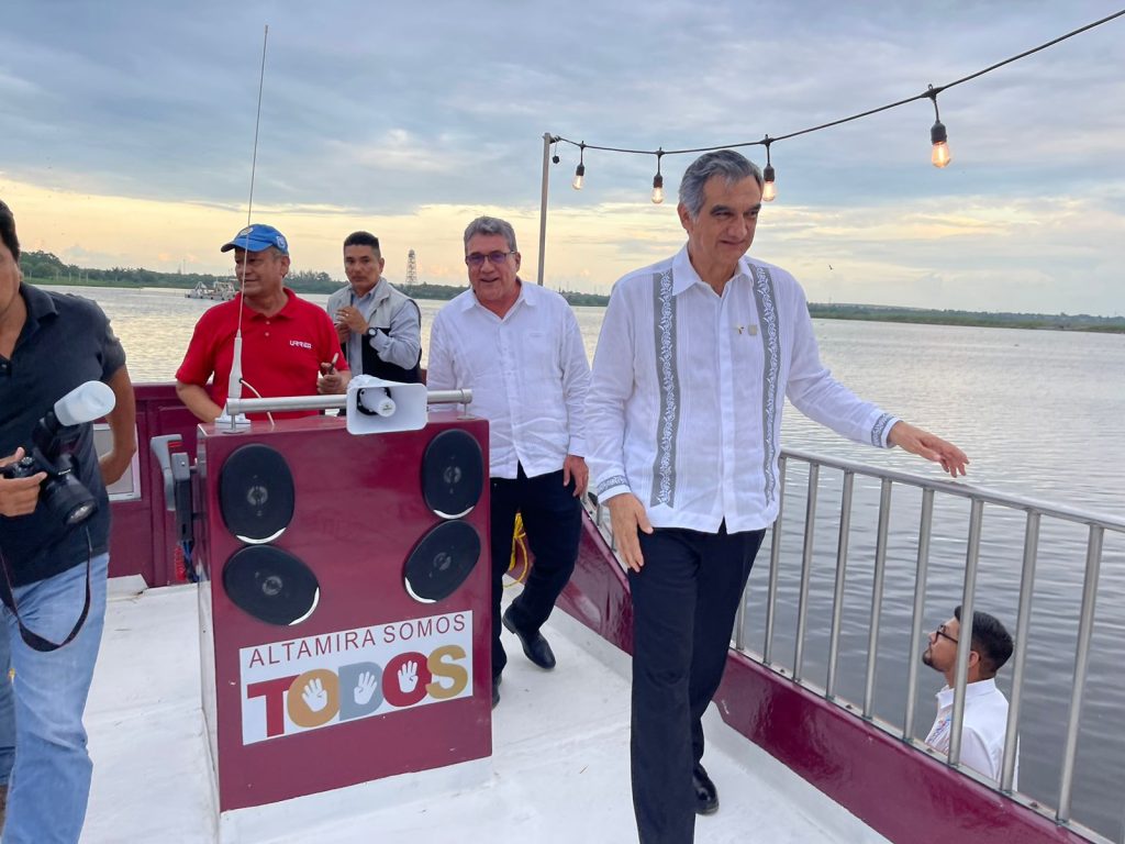 Altamira, Tamps. – El gobernador del Estado, Dr. Américo Villarreal Anaya, y el presidente municipal de Altamira, Mtro. Armando Martínez Manríquez, supervisaron la tarde de este domingo el avance de los trabajos de limpieza y desazolve que se realizan en la laguna de Champayán.