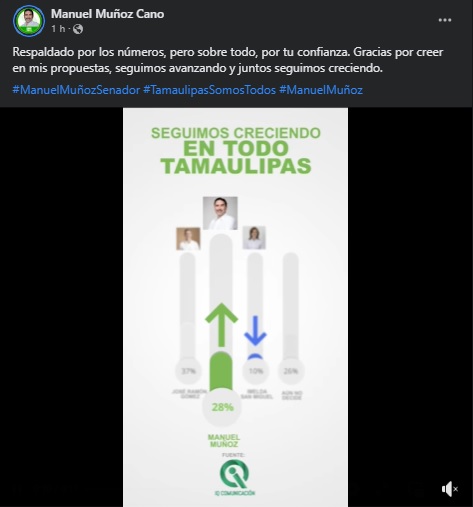 Tan es así que los números de las encuestas son alentadoras para Muñoz Cano, ya que en cuanto supo del último sondeo de IQ Comunicación, compartiría en su red social de Facebook, los resultados acompañado del siguiente mensaje: “respaldado por los números, pero, sobre todo, por tu confianza. Gracias por creer en mis propuestas, seguimos avanzando y juntos seguimos creciendo”.