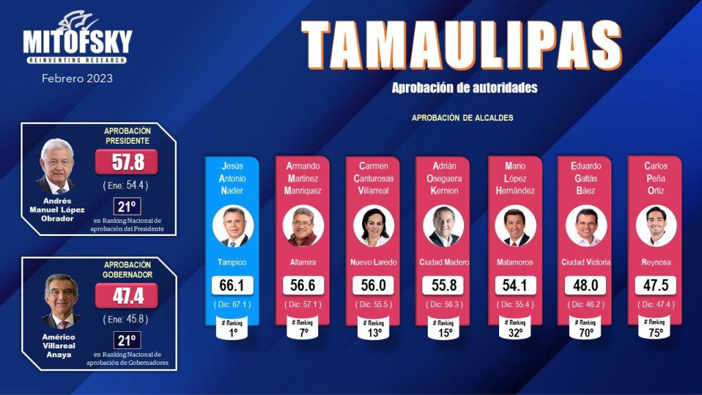 Con relación al presidente de la República, Lic. Andrés Manuel López Obrador su aprobación y popularidad se mantiene vigente entre los tamaulipecos, mientras que la aceptación por el desempeño del gobernador del Estado, Dr. Américo Villarreal Anaya, va en franco aumento.