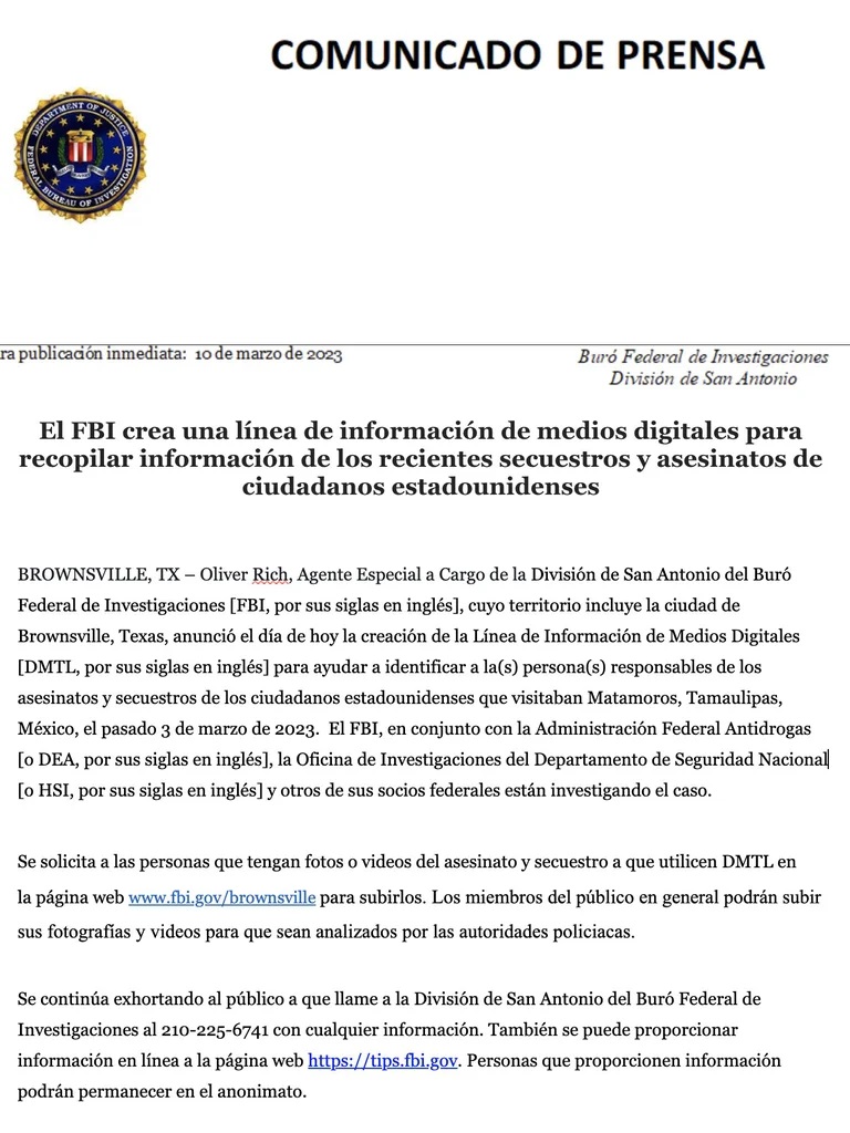 FBI solicitó a ciudadanos enviar fotos y videos para dar con secuestradores de estadounidenses en Matamoros