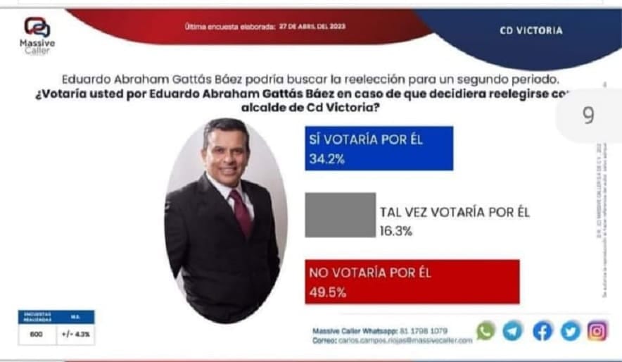 ✍🏼 Según la encuestadora Massive Caller el 45. 5 % NO VOTARIA por Eduardo GATTAS.