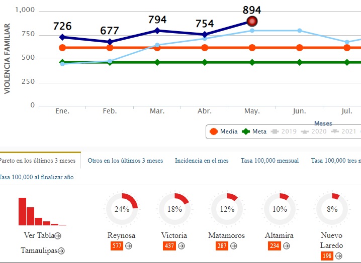 Estadísticamente, Tamaulipas presenta una incidencia de enero a mayo del 2023 de 3 mil 845 casos de violencia familiar según datos aportados por la asociación de “Semáforo Delictivo”, a detalle se presentan: enero, 726 casos; febrero, 677 incidencias; marzo, 794 casos; abril, 754 incidencia y mayo, 894 casos. Dichos aportes presentan una media de 769 casos mensualmente, lo pudiera representar 25 casos diarios en todo el Estado de Tamaulipas. Resaltando el Municipio de Reynosa con 577 casos (24% – Primer lugar), Ciudad Victoria con 437 incidencias (18% – Segundo lugar), Matamoros con una cifra de 287 (12% – Tercer Lugar), Ciudad Altamira con 234 casos (10% – Cuarto lugar) y Nuevo Laredo con 198 incidencia (8% – Quinto Lugar).