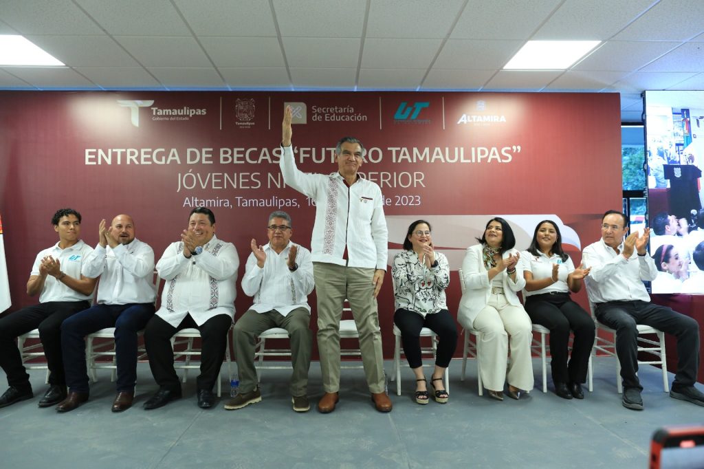 Al presidir la entrega de becas “Futuro Tamaulipas” Jóvenes Nivel Superior, en el auditorio de la Universidad Tecnológica de Altamira y tras ser recibido entusiastamente por la comunidad universitaria, el mandatario estatal expresó su reconocimiento y su compromiso para seguir alentando el desarrollo de centros educativos como este plantel universitario, en donde son tan obvios los resultados de excelencia y a la vez, llamó a las y los estudiantes a sumarse a los tiempos de transformación y de cambio que vive la entidad y ser partícipes de su entorno social, sirviendo para mejorar su desarrollo profesional o el de la sociedad.