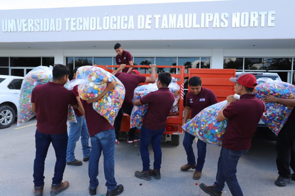 Reynosa, Tamps. – Con el firme propósito de contribuir al bienestar de quienes más lo necesitan, acorde a la visión humanista del gobernador Américo Villarreal Anaya, alumnas y alumnos de la Universidad Tecnológica de Tamaulipas Norte, se sumaron a la lucha contra el cáncer, mediante la colecta y entrega de 160 mil taparroscas a Voluntad Contra el Cáncer A.C., organización cuyo objeto es apoyar a niñas y niños con cáncer de escasos recursos.