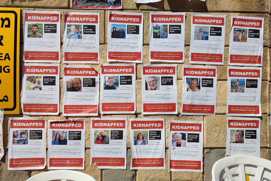 TEL AVIV (ISRAEL), 17/10/2023.- Vista de varios carteles de personas secuestradas por Hamás, este martes en Tel Aviv (Israel). Sólo quiero a mis nietos de vuelta en casa. Sacarlos a pasear como solía hacer", confiesa entre la rabia y la desazón Shmuel, abuelo de tres niños secuestrados en Gaza por el grupo islamista Hamás el fatídico sábado del 7 de octubre, cuando su brazo armado acometió la mayor masacre de civiles de la historia de Israel. EFE/ Sara Gómez Armas