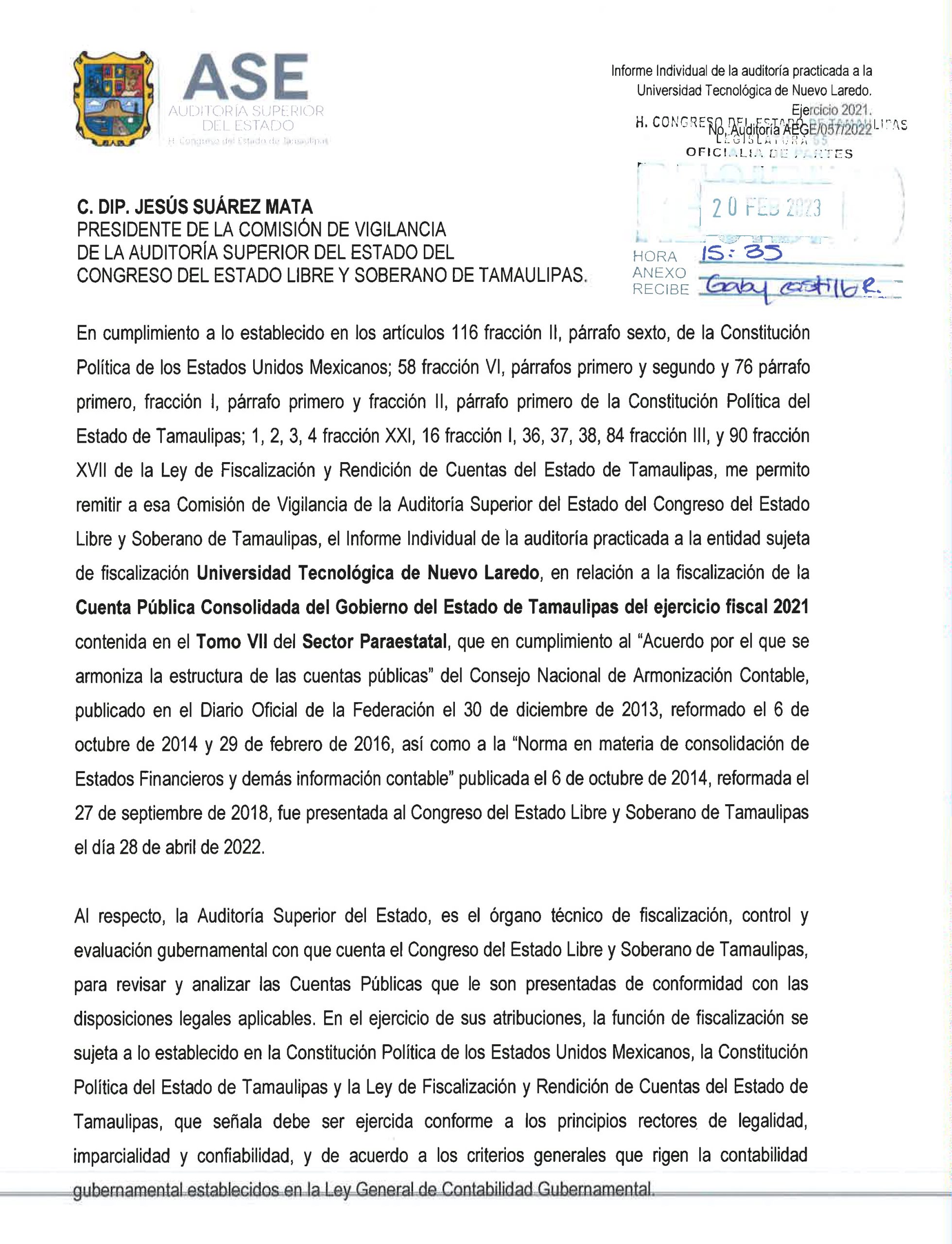 Nuevo Laredo, Tamps.- La Auditoría Superior del Estado (ASE) continúa en las indagatorias practicadas a la Universidad Tecnológica (UT) de Nuevo Laredo del Ejercido Fiscal 2021 con la procedencia de la auditoría número AEGE/057/2022, que originó las observaciones que arrojan un monto de $ 87,130,020.18 (Ochenta y siete millones ciento treinta mil veinte pesos con dieciocho centavos 18/100 M.N), información que es del conocimiento del legislador morenista, Jesús Suárez Mata, Presidente de la Comisión de Vigilancia de la ASE del Congreso del Estado Libre y Soberano de Tamaulipas, recibido en la oficialía de partes el día 20 de febrero a las 15:35 horas del año en curso.