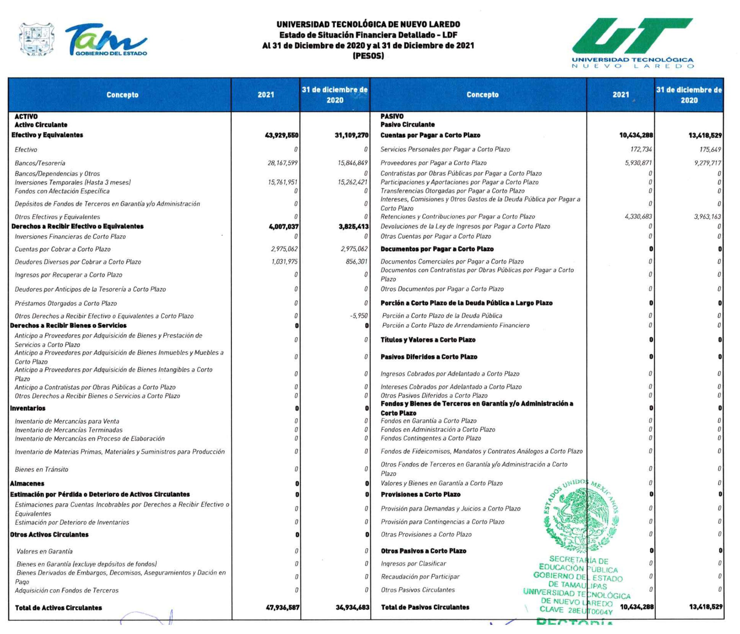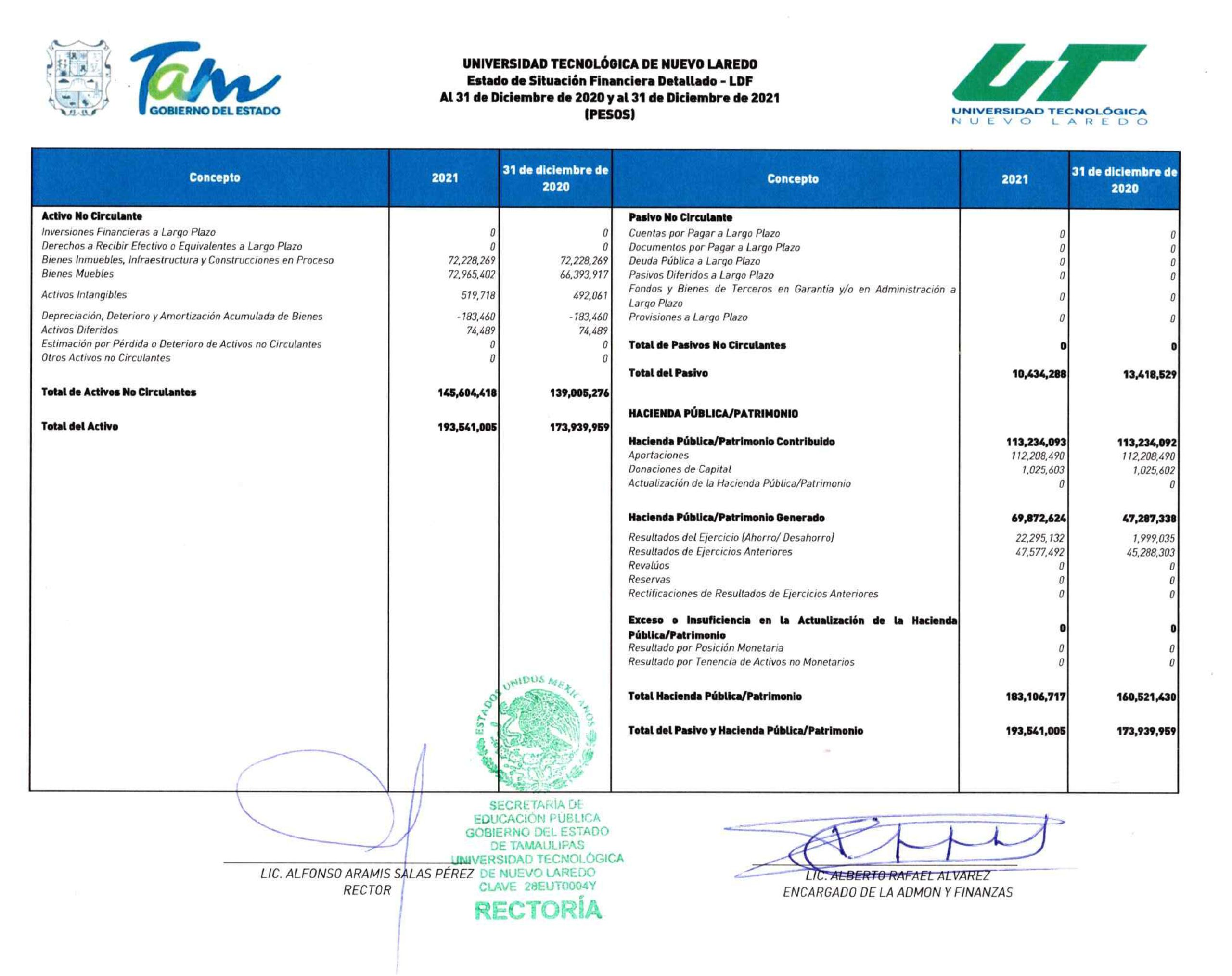 CP2021-TEC. LAREDO-Estado de Situacion Financiera Detallado-LDFINFORME DE LA AUDITORÍA PRACTICADA A LA ENTIDAD UT NUEVO LAREDO EJERCICIO 2021