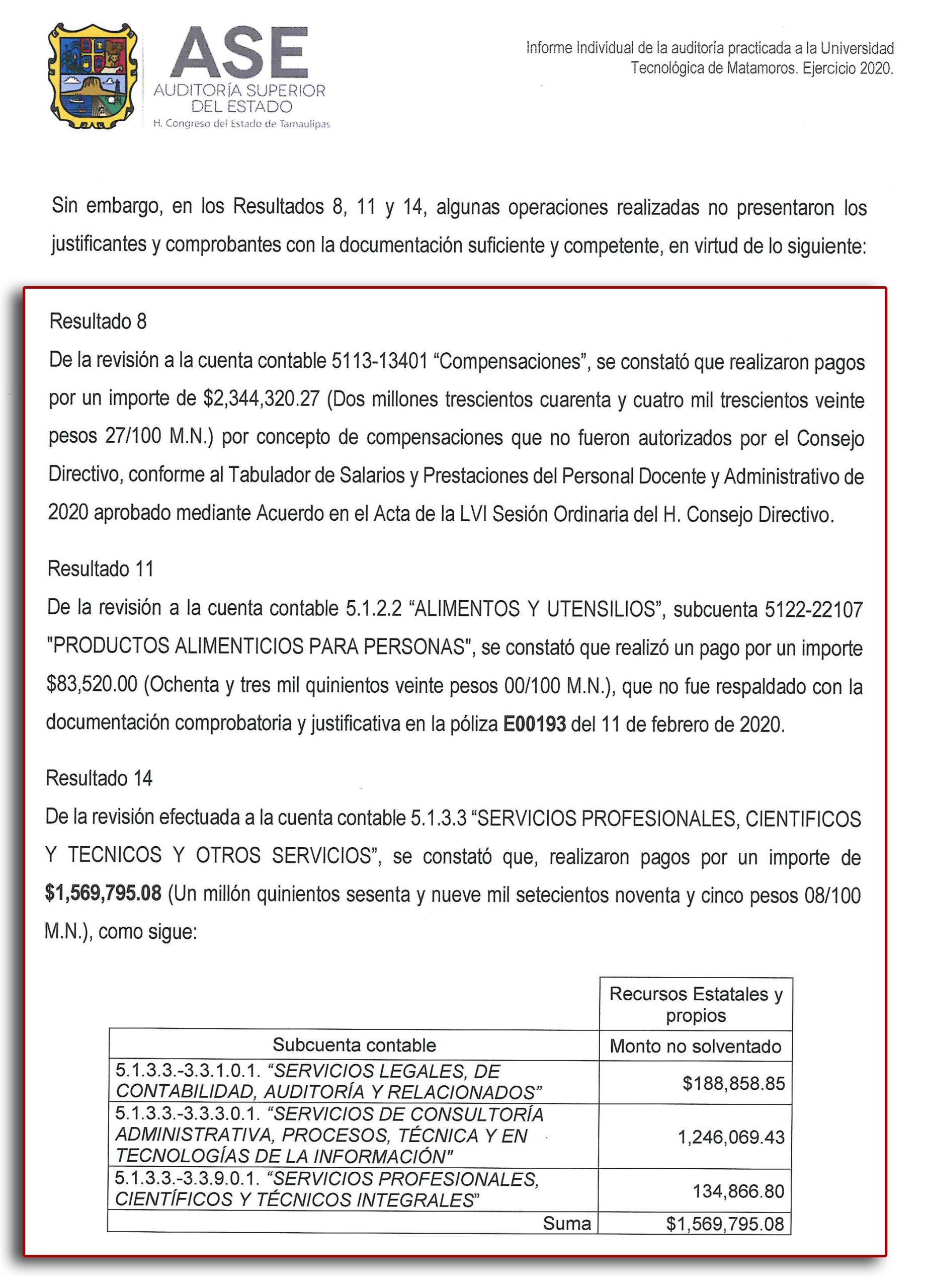 “Lo anterior, como lo dispone la Ley General de Contabilidad Gubernamental, la Ley de Gasto Público, la Ley de Adquisiciones para la Administración Pública del Estado de Tamaulipas y sus Municipios; el Presupuesto de Egresos del Estado de Tamaulipas, para el ejercicio Fiscal 2020, y los Lineamientos Generales Aplicables al Comité de Compras y operaciones Patrimoniales, se concluye que la información recibida, su análisis y las verificaciones, amerita promover acciones correspondientes” de los resultados 8, 11 y 14, reza dicho informe recibido en el Congreso de la Legislatura 55.
