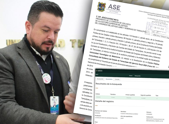 Durante el Ejercicio Fiscal 2020 que obra ante la ASE se tiene registrado un hallazgo que “no fue comprobado” de la UT Matamoros en: compensaciones, alimentos y utensilios y servicios profesionales, científicos y técnicos y otros servicios mientras que el exrector Flavio Hinojosa Álvarez (2018-2022) ostentaba el grado de maestría en documentos oficiales sin contar con cédula profesional omitiendo la ley reglamentaria del Art. 5 Constitucional.