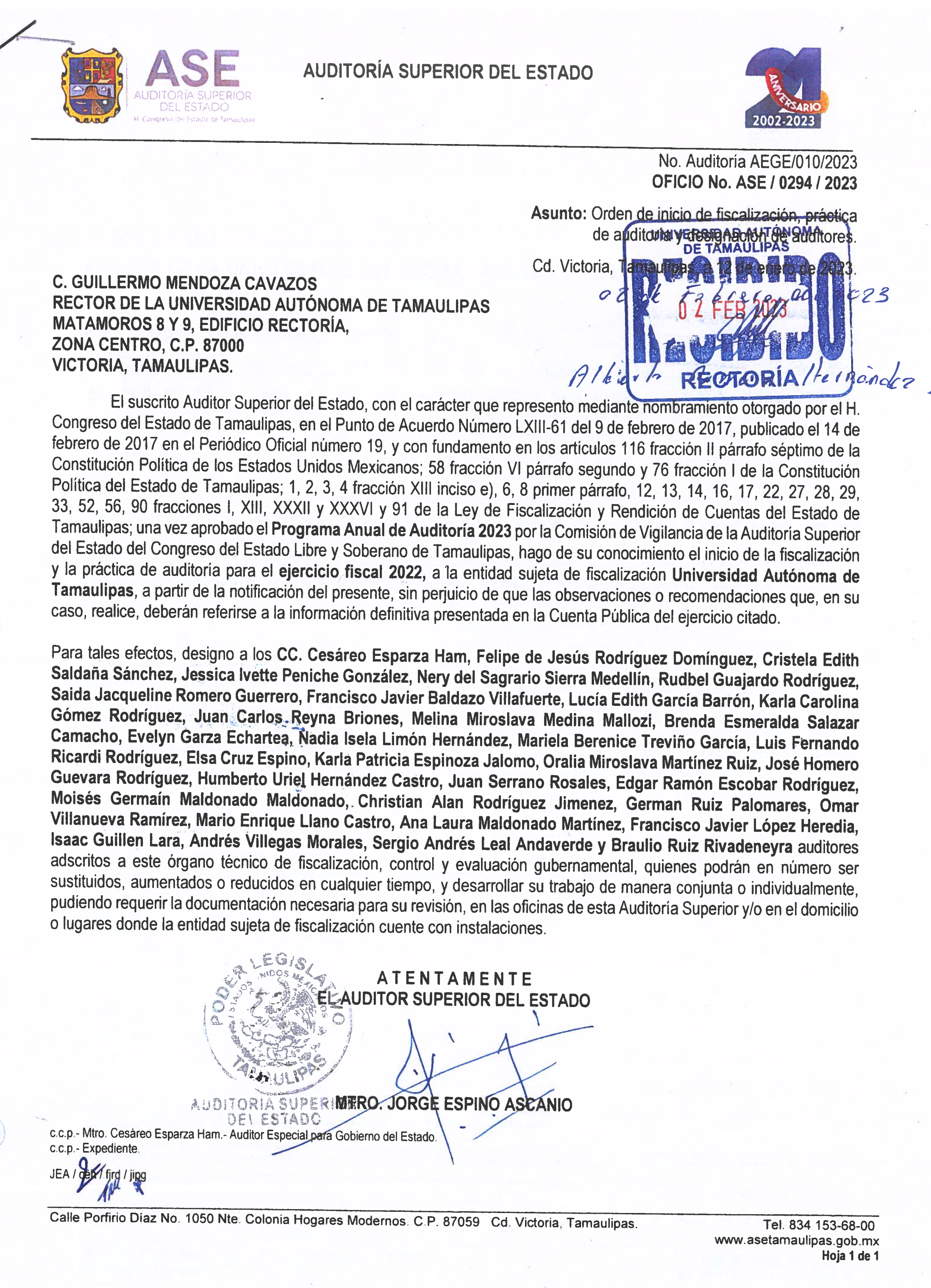 Este oficio fue dirigido al rector de la Universidad Autónoma de Tamaulipas, Guillermo Mendoza Cavazos, en la dirección Matamoros 8 y 9, Edificio Rectoría de la zona centro de Ciudad Victoria, por el Auditor Superior del Estado, Jorge Espino Ascanio. En dicho oficio se indica que la fiscalización y práctica de auditoría se llevarán a cabo «una vez aprobado el Programa Anual de Auditoría 2023 por la Comisión de Vigilancia de la Auditoría Superior del Estado del Congreso del Estado Libre y Soberano de Tamaulipas». Dicha comisión está presidida por el diputado local de Morena, Jesús Suárez Mata.