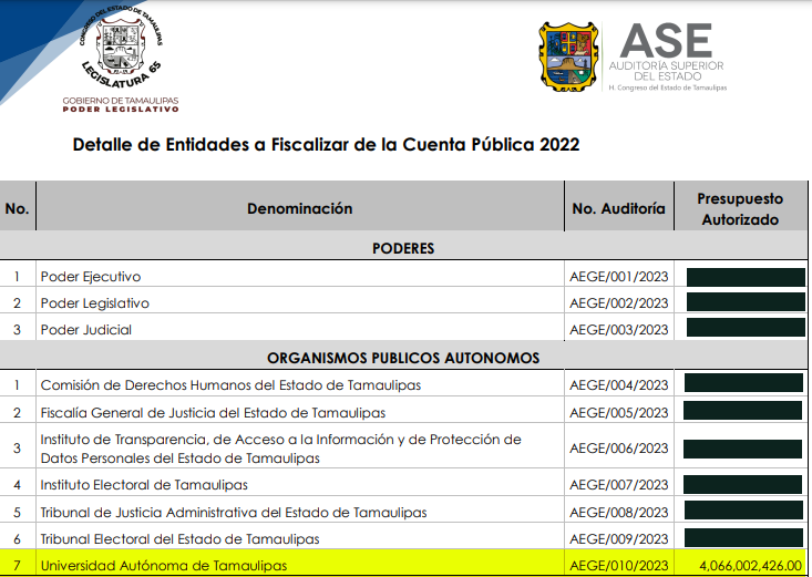 Por otra parte, de acuerdo con la investigación desarrollada por Noticias PC, la auditoría a la que está siendo sujeta de fiscalización la Universidad Autónoma de Tamaulipas corresponde en parte a los trabajos del “Programa Anual de Auditoría 2023”, que contempló la ASE para 160 entidades, 68 correspondientes a la Auditoría Especial para Gobierno del Estado, 92 entidades bajo revisión de la Auditoría Especial para Ayuntamientos, así como llevaremos a cabo 30 auditorías de desempeño sobre programas y acciones de las entidades sujetas de fiscalización.