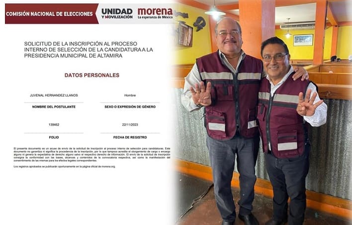 En el evento se mostró la constancia oficial del registro y se consideró que Juvenal Hernández Llanos está buscando la oportunidad de ser postulado por la alcaldía de Altamira encabezando y, LANZADO POR LOS FUNDADORES DE MORENA.