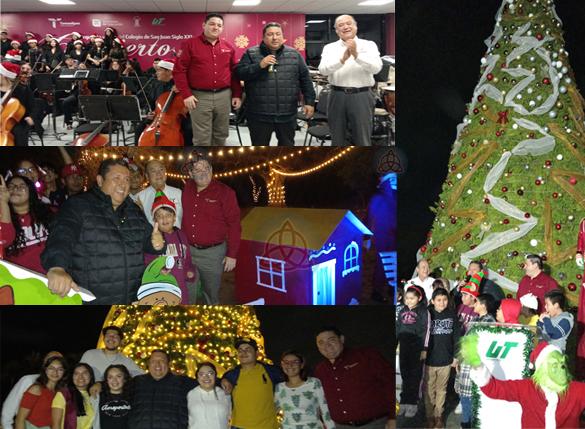 Altamira, Tamps.- El Rector de la Universidad Tecnológica (UT) de Altamira, Juan Dionisio Cruz Guerrero, encabezó la celebración del encendido del pino de Navidad y la villa navideña en las instalaciones de la casa de estudios, marcando un precedente en la historia de la universidad. Antes del concierto navideño, expresó la importancia de estas festividades en la institución.