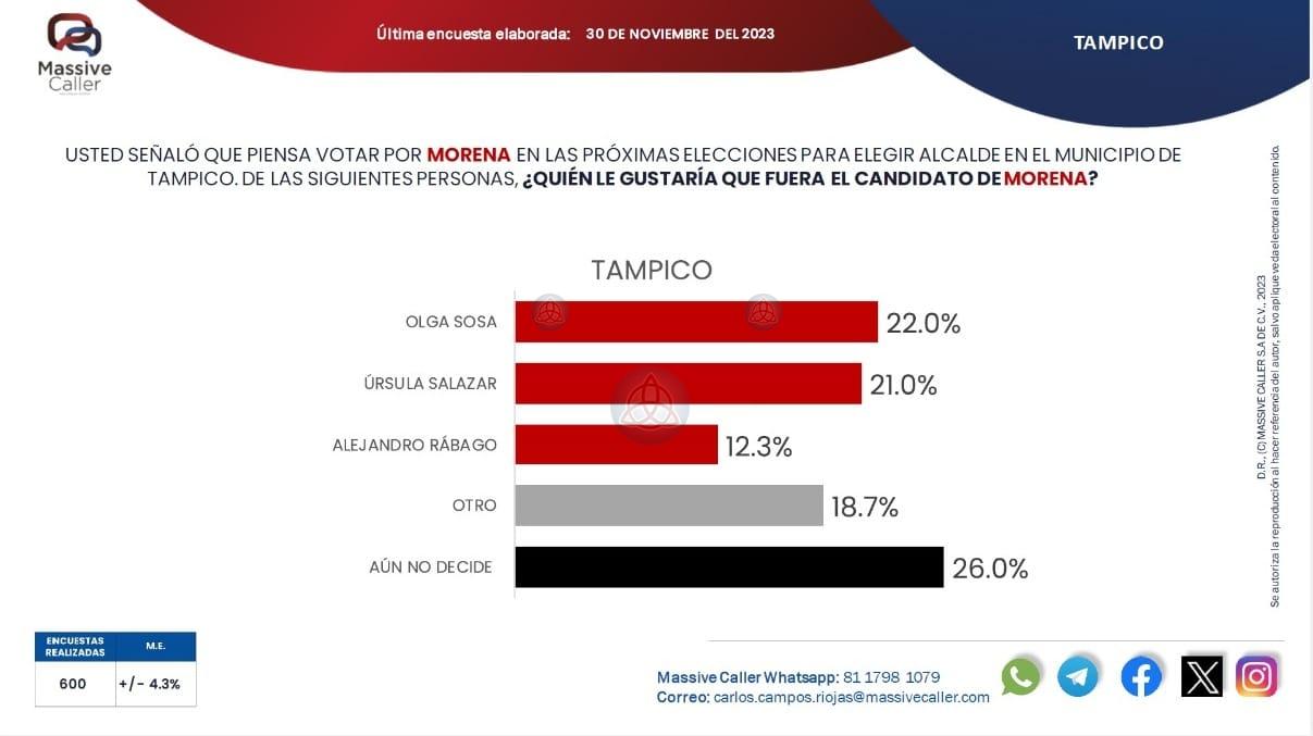 Aunque en la encuesta de Massive Caller se menciona a la actual secretaria de trabajo en Tamaulipas, Olga Sosa, con un punto porcentual por encima de Úrsula Salazar, es importante destacar que Sosa no ha formalizado su registro como aspirante a la candidatura para la alcaldía de Tampico. En los careos entre los candidatos de Morena y Acción Nacional, Salazar Mojica muestra una ventaja significativa sobre el puntero del PAN.