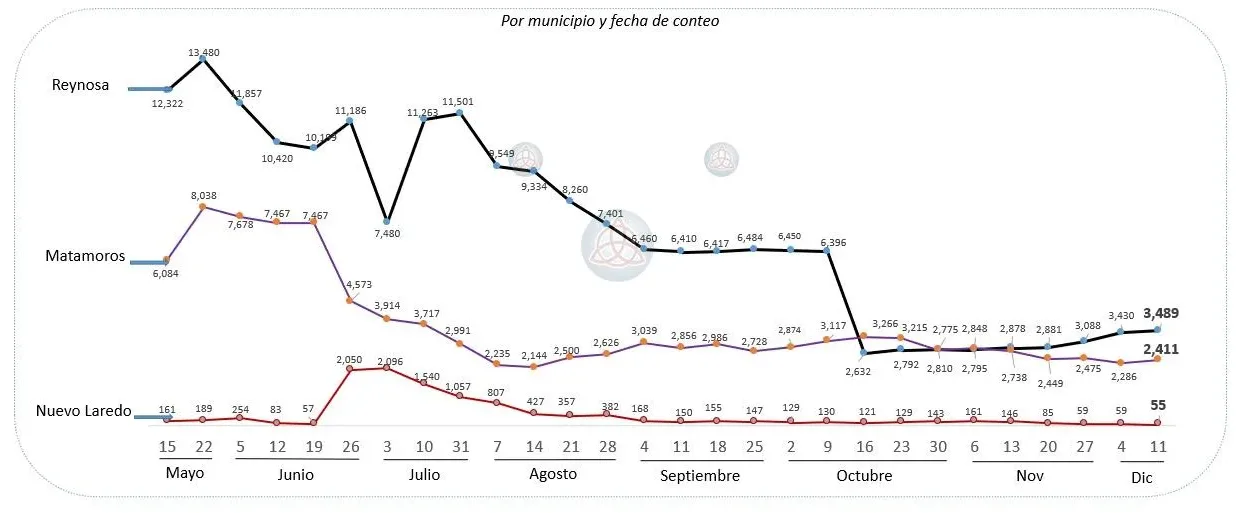 Detalló que en Matamoros, hay seis albergues con un total de 2411 migrantes; En Reynosa son 8, con un total de 3489 personas; Mientras que Nuevo Laredo tiene 3 puntos de concentración con 55 migrantes.