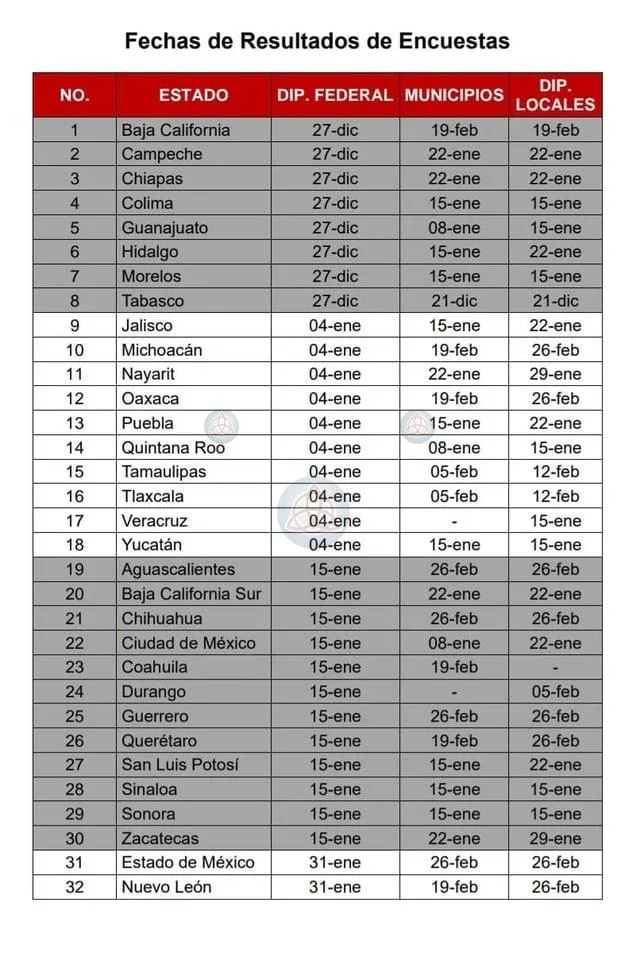 Mientras que los aspirantes a municipios se conocerán entre el 21 de diciembre y el 26 de febrero del 2024; lo mismo ocurrirá para las diputaciones locales.
