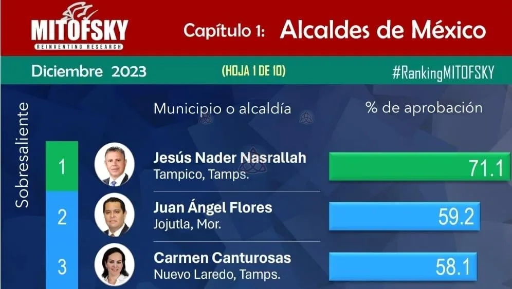 ✒️ La encuestadora Mitofsky, desde el año 2020 y hasta el 2023 ha mantenido Jesús “Chucho” Nader Nasrallah en primer lugar de aceptación en 21 ocasiones lo que reafirma el oficio político, experiencia, cercanía con la gente y capacidad para solucionar los problemas de la gente e impulsar el desarrollo de Tampico.