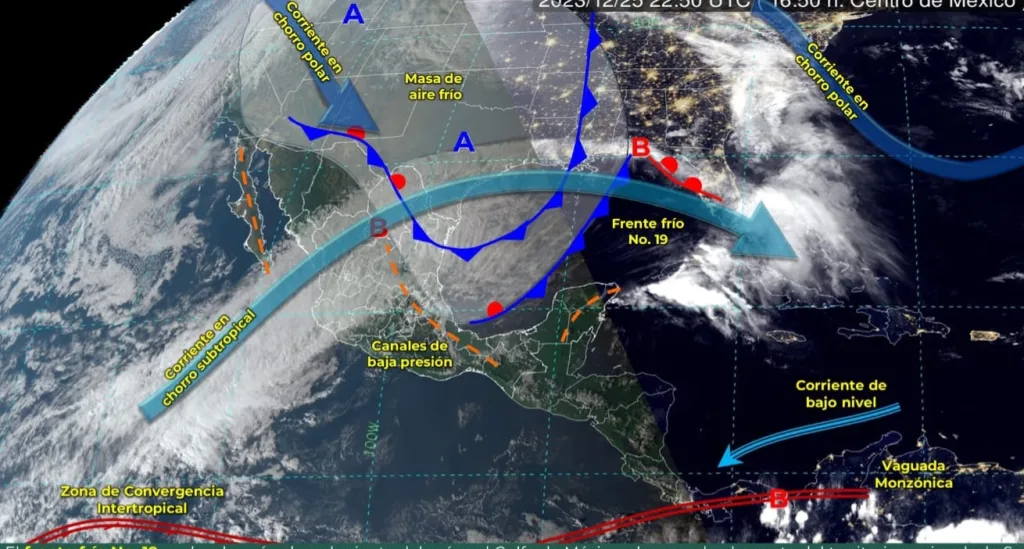 El Servicio Meteorológico Nacional confirmó en su aviso 718, del lunes 25 de diciembre, que el fenómeno climático ya cubre con su masa de aire frío el noroeste, norte y noreste de la República Mexicana.