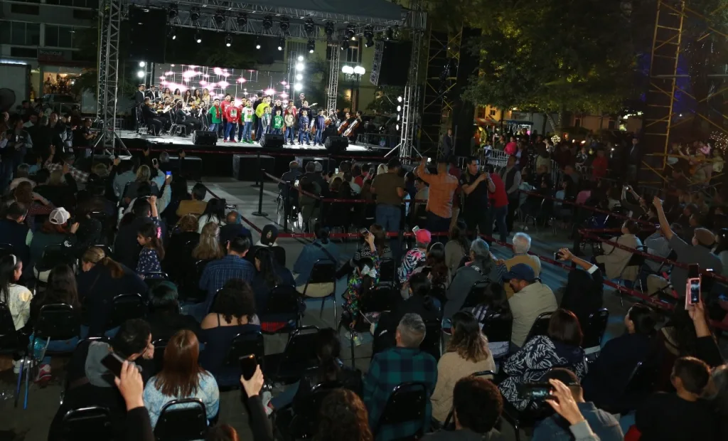 La velada fue amenizada por el Tempus Quartet y la Ópera Ambulante Tamaulipas, bajo la dirección de Ceci Govea. Este conjunto musical, compuesto por 23 talentosos músicos originarios de diversos municipios del estado, brindó una experiencia única que contó con la participación destacada de la soprano Isabel Govea y el tenor Héctor Gamaliel. Además, se sumaron al escenario el coro de niños de la escuela primaria Club de Leones turno matutino, quienes junto a los artistas interpretaron de manera conmovedora «Noche de Paz».