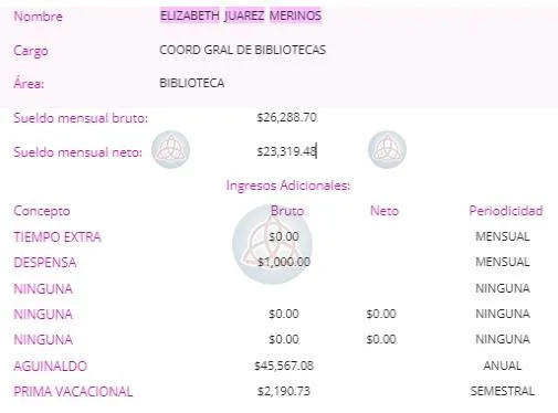 Juárez Merinos, como servidora pública e integrante del sindicato percibe un sueldo mensual bruto de 26 mil 288.70 pesos, por concepto de despensa mensual anual de 12 mil pesos, mientras que por concepto de aguinaldo su percepción bruta es de 45 mil 567.08 pesos y por concepto de vacaciones anualmente recibe la cantidad de 8 mil 762.90 pesos. Por lo tanto, anualmente devenga un sueldo bruto del municipio de Tampico la cantidad de 381 mil 794.38 pesos.