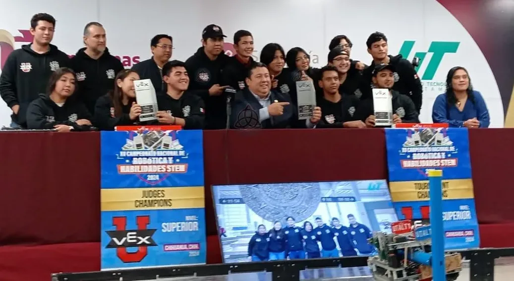 Cruz Guerrero compartió la noticia de que la Universidad Tecnológica de Altamira ganó en dos etapas en el torneo nacional: el torneo VEX U Robotics y el campeonato de jueces, reconociendo así la excelencia en programación mecánica y construcción.