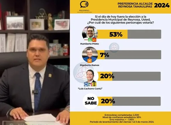 Cita la encuesta, «Sí, el día de hoy fuera la elección a la presidencia municipal de Reynosa, ¿usted por cuál de los siguientes personajes votaría?, Humberto Prieto, Rigoberto Ramos o Luis René Cantú».