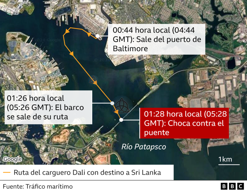 Un barco carguero, identificado como el buque Dali y con bandera de Singapur, colisionó violentamente contra uno de los pilares del puente, desencadenando su derrumbe sobre el río Patapsco.