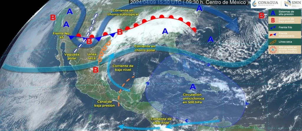 En su comunicado de prensa número 0247-24, el SMN, asegura que dicho fenómeno meteorologico viene acompañado por una vaguada polar y corrientes en chorro polar y subtropical que originarán además vientos con rachas de 70 a 90 kilómetros por hora (km/h) y condiciones para la formación de torbellinos o tornados en dichas entidades.