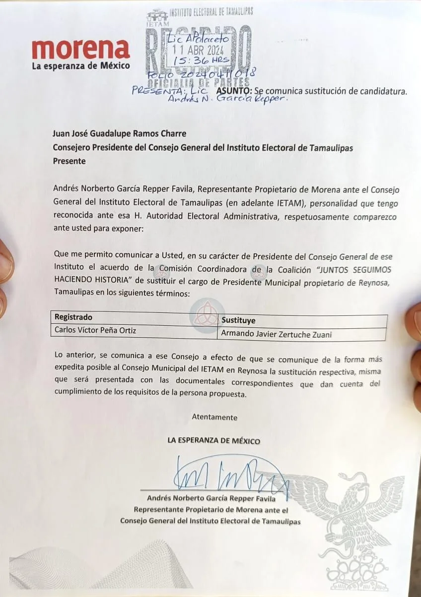 En breve entrevista, García Repper, indicó que iban a comunicar a la dependencia electoral la sustitución de candidatura, «y será Armando Zertuche, quien a partir de que lo apruebe el IETAM, será nuestro candidato a la alcaldía de Reynosa».