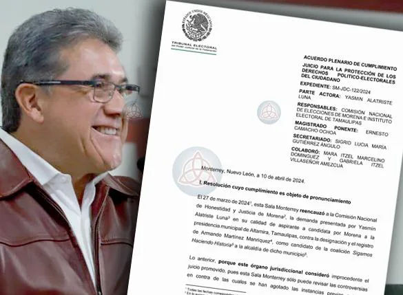Cabe precisar que la Comisión de Justicia de Morena, en cumplimiento de la orden emitida por la Sala Monterrey, declaró improcedente la queja de Alatriste Luna sobre el registro de Martínez como candidato de la Coalición Sigamos Haciendo Historia a la presidencia municipal de Altamira.