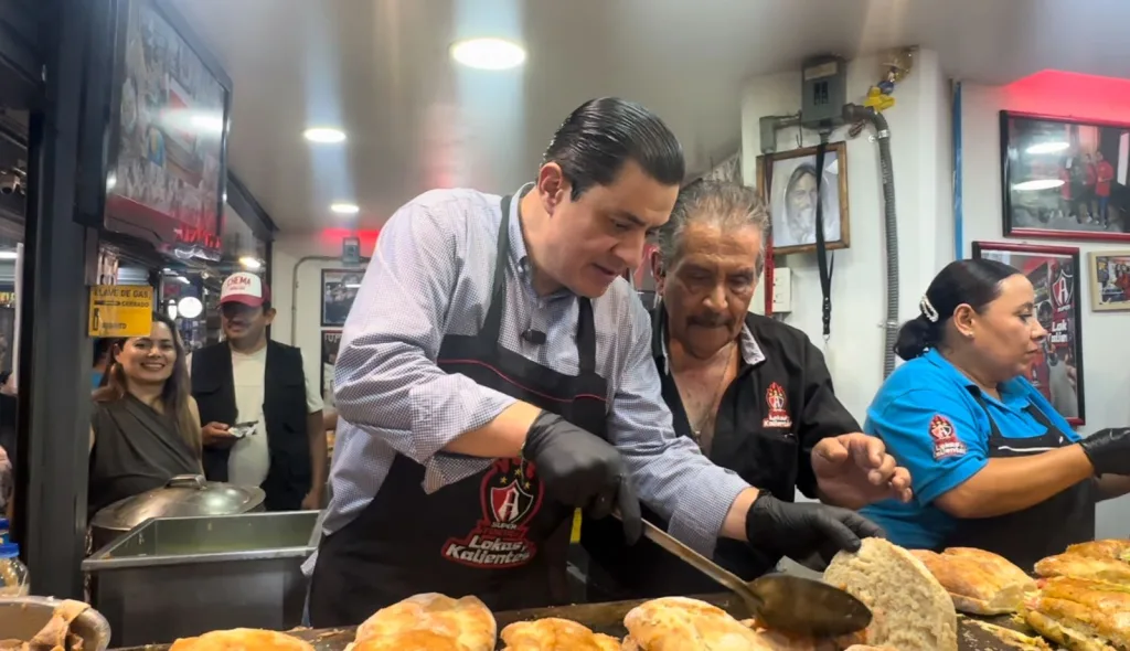 El morenista se detuvo en cada puesto y toda vez que la gente lo abordaba a su paso, se dio tiempo para comer la tradicional birria en el chivo de oro, y hasta de preparar una torta loca con don Chava, una de las más populares en el mercado.