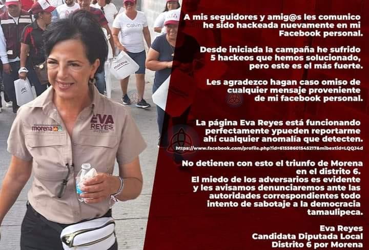 Reynosa, Tamps.- Por quinta ocasión fueron hackeadas las redes sociales de Eva Reyes, candidata de Morena a la diputación social por el Sexto Distrito de Reynosa.