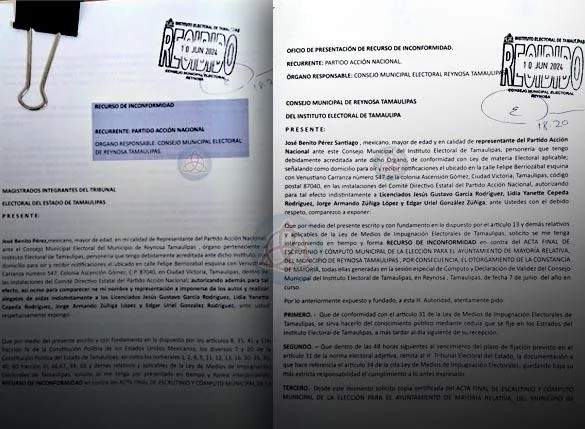 El documento, fechado el 10 de junio, impugna el acta final de escrutinio y cómputo municipal de la elección de Reynosa, así como la otorgación de la constancia de mayoría.