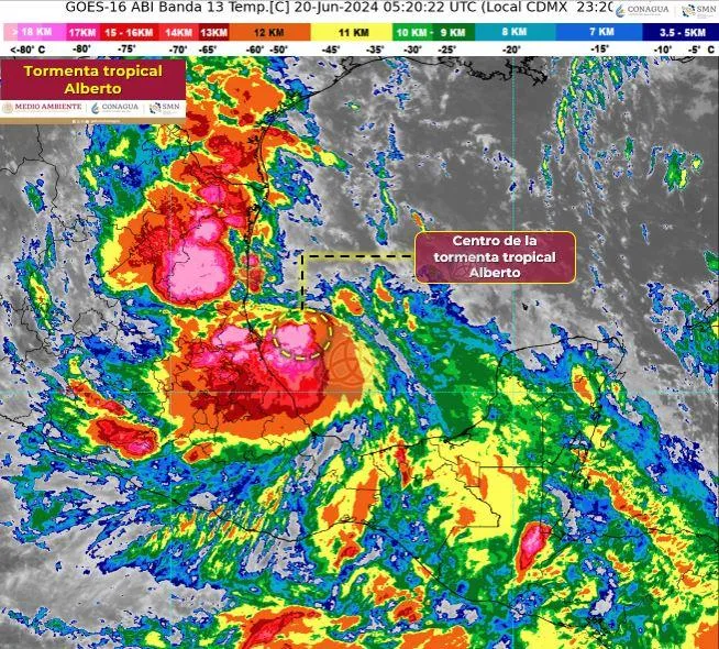 El Servicio Meteorológico Nacional reveló en su aviso de las 00:15 horas de este jueves 20 de junio, que ‘Alberto’, se localiza 130 km al este-noreste de Cabo Rojo, Veracruz, y a 190 km al este-sureste de Tampico, Tamaulipas.