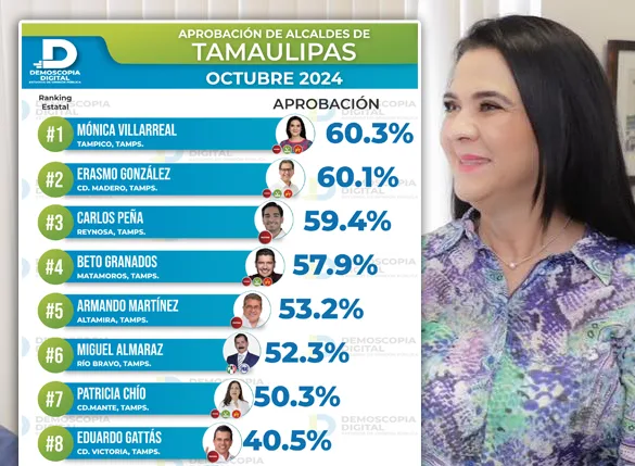Según el estudio, Villarreal Anaya ocupa el primer lugar con una puntuación del 60.3%, seguida por Erasmo González Robledo, alcalde de Ciudad Madero, con un empate técnico del 60.1%, y Carlos Peña, de Reynosa, con un 59.4%.