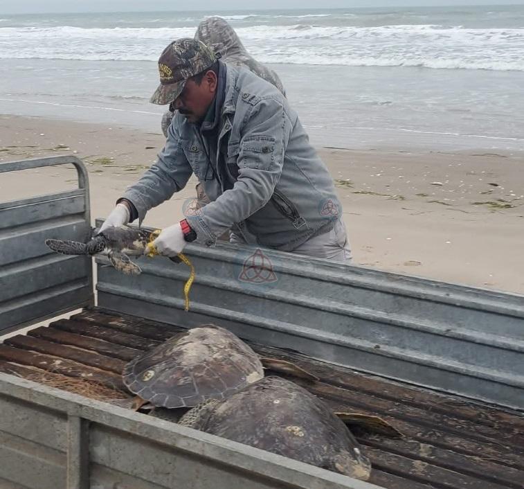 Soto La Marina, Tamps.- Personal de la Comisión de Parques y Biodiversidad de Tamaulipas (CPBT) rescató 40 ejemplares tortuga verde (Chelonia mydas), que estaban varadas por las secuelas de la onda gélida que afecta al estado.