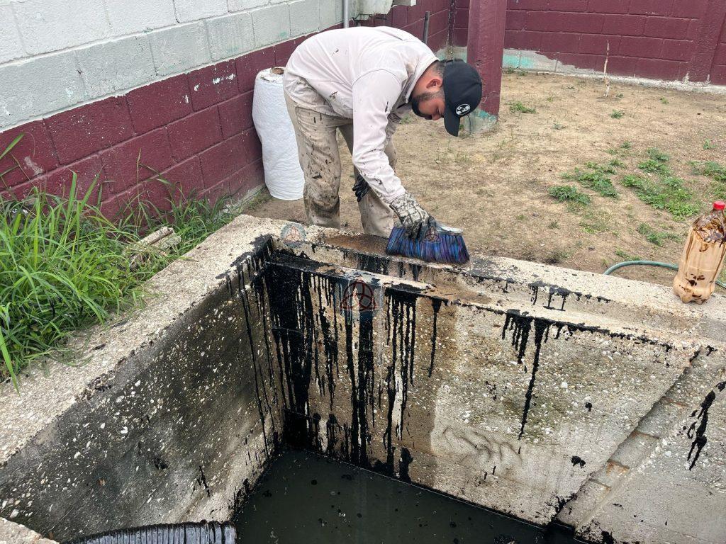 Ciudad Altamira, Tamps.- Debido a un remanente de la fuga de hidrocarburo ocurrida hace unos días en el Fraccionamiento Villas del Sol y que llegó a las instalaciones de bombeo del organismo, personal técnico especializado de la Comisión Municipal de Agua Potable y Alcantarillado de Altamira lleva a cabo labores de limpieza en el cárcamo del sector Adolfo López Mateos.