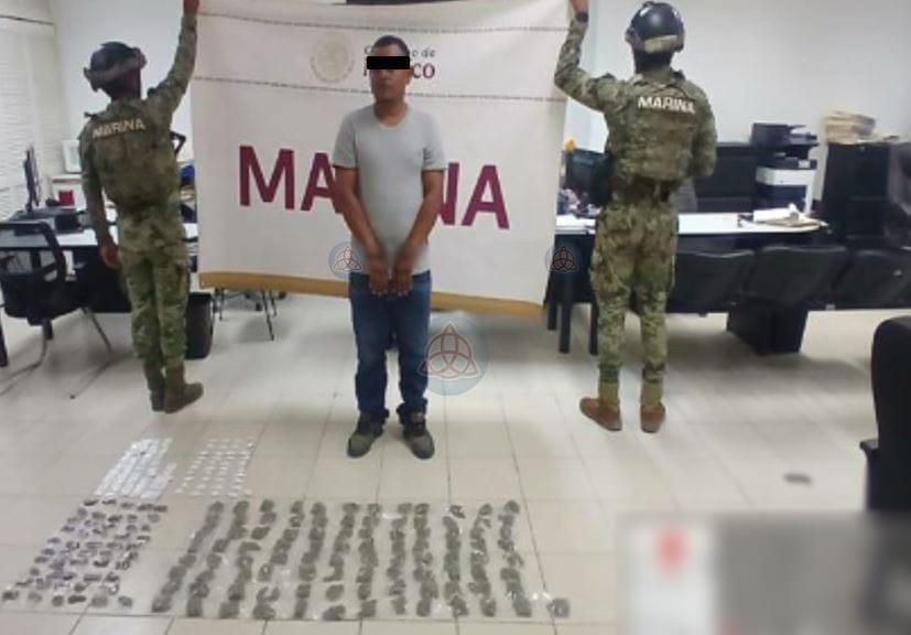 En acciones paralelas, pero en otro punto del municipio, personal de la Secretaría de Marina (Semar) realizó la detención de un individuo en la colonia Modelo, quien tenía en su poder 148 dosis de marihuana, 86 de cocaína y 50 de metanfetamina, así como dinero en efectivo, lo que hace presumir actividades de narcomenudeo.