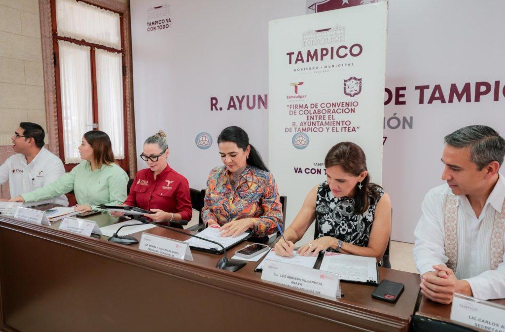 Entre las autoridades presentes en la firma de este convenio estuvieron la presidenta del Sistema DIF Tampico, Luz Adriana Villarreal Anaya; el secretario del Ayuntamiento, Carlos Alberto García; y, por parte del ITEA, el coordinador de zona en Tampico-Madero, Nicandro Vadir Alvarado Maldonado.