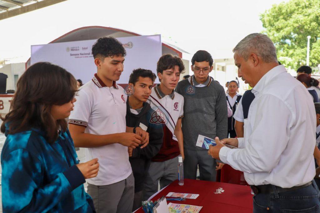 Fue en las instalaciones del CBTIS 236 de esta ciudad, en donde se realizó el evento protocolario que forma parte de las acciones de la Semana Nacional que concluye el próximo 13 de septiembre, con la representación del secretario de Salud, Vicente Joel Hernández Navarro, el director general y Unidad de Políticas de Salud y Bienestar Poblacional, Rembrandt Reyes Nájera, convocó a las y las estudiantes a participar en estas actividades que contempla servicios completamente gratuitos como la vacunación, chequeos médicos, orientación para la nutrición, talleres que nos ayudan a cuidar el cuerpo y mente, entre otras actividades.