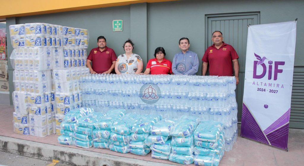 La aportación consiste en 2,400 botellas de agua, 230 paquetes de papel sanitario y 310 bolsas de jabón detergente, artículos de primera necesidad que serán distribuidos entre los hogares damnificados a través de los programas asistenciales del organismo.