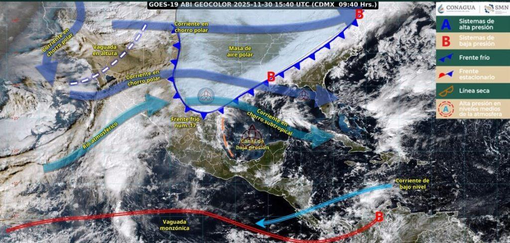 En el noroeste del país, una vaguada en niveles medios y altos, en interacción con las corrientes en chorro polar y subtropical, generará un ambiente más frío, lluvias aisladas y rachas de viento que podrían alcanzar los 60 km/h en Baja California Sur, Sonora, Chihuahua, Durango y Sinaloa.
