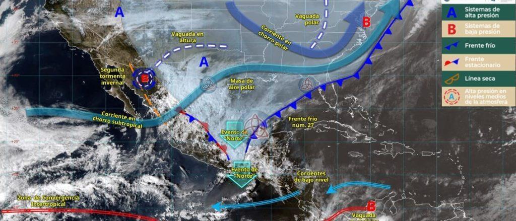 A nivel nacional, el sistema frontal ocasionará lluvias torrenciales en Veracruz, Oaxaca, Chiapas y Tabasco, así como nevadas o aguanieve en estados del norte y centro del país, mientras que el evento de Norte será prolongado en el litoral del Golfo de México.