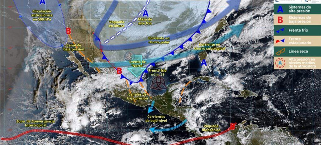 Ciudad Victoria, Tamps.— La Coordinación Nacional de Protección Civil (CNPC) activó una alerta preventiva por el ingreso del Frente Frío número 29, que provocará un marcado descenso de temperaturas, lluvias y vientos intensos en diversas regiones del país, con impacto directo en Tamaulipas, donde se prevé un nuevo evento de “Norte” a partir de la noche de éste sábado.