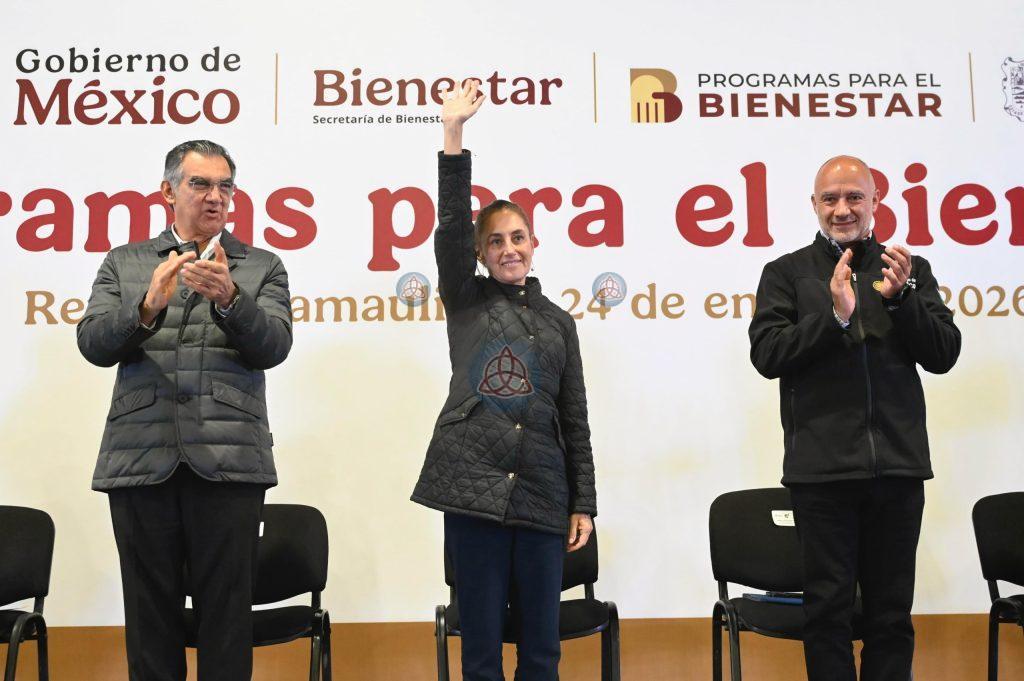 Reynosa, Tamps.- Desde Reynosa, Tamaulipas, la Presidenta de México, Claudia Sheinbaum Pardo, destacó que cuando se elimina la corrupción, alcanza para realizar más acciones. Por ello, anunció que en el estado se implementan los Programas para el Bienestar que benefician a 816 mil personas, se repavimentarán 407 kilómetros (km) de carreteras federales, se construirá el Bachillerato Tecnológico Plantel Reynosa y se crearán nuevos puentes, así como obras en materia de agua y el tramo Saltillo-Nuevo Laredo del Tren del Golfo de México.